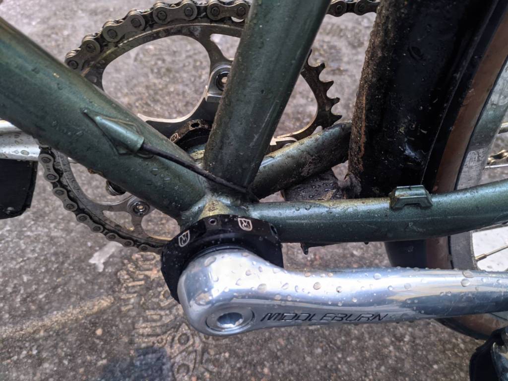 The conversion is done using the Velo Orange-branded First Components eccentric bottom bracket and a 142mm Paul Fixed Disk Word hub. I needed a 24mm crank for the bottom bracket so the Middleburn cranks followed. All feels and performs great, though the bottom bracket is pretty ugly. I recently took it apart to replace the bearings (testing out the suspension linkage bearing idea written about at the Radavist), and the unit is simple and nicely designed. It hasn’t slipped or creaked at all, even though the NDS bearings were already rusted through. You have to take your time making sure the cups are aligned, which can be pretty infuriating to get just right, but I think that if you do there shouldn’t be any issues. I’m a bit worried about the six tiny grub screws seizing or stripping, so I’ve been checking them a lot and this time put way too much grease in there just to make sure. They still haven’t slipped.